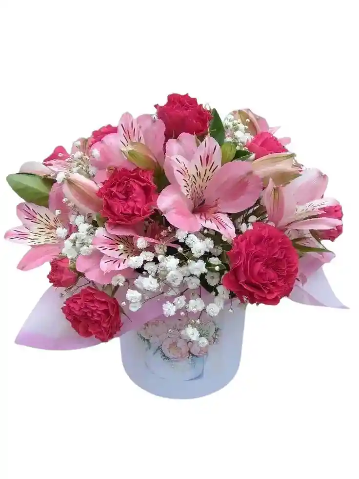 Caja con 10 claveles fucsias , 1 a 2 paquetes astromelia y gypsophila Nota: La flor puede ser sustituida dependiendo la disponibilidad de color y del producto “Mensaje Personalizado” máximo de 30 caracteres (Dejar el mensaje en el chat, los comentarios no se previsualizan para la tienda por lo que si se dejan allí no podrá ser incluido).