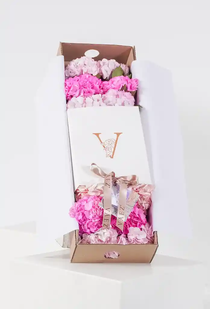 Caja de lujo de carton corrugado brandeada con la imagen de la marca, con 12 hortensias en su interior sobre puesto de las flores un fajon con la identificada y papel Vaez. (Sujeto a disponibilidad de colores) Lleva cinta satinada, tarjeta para mensaje, cuidado de la flor y alimento para flores