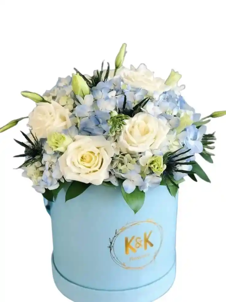 Caja redonda de 3 hortencia azules y 4 rosas blancas y 4 lirios blancos con rusco Nota: La flor puede ser sustituida dependiendo la disponibilidad de color y del producto “Mensaje Personalizado” máximo de 30 caracteres (Dejar el mensaje en el chat, los comentarios no se previsualizan para la tienda por lo que si se dejan allí no podrá ser incluido).