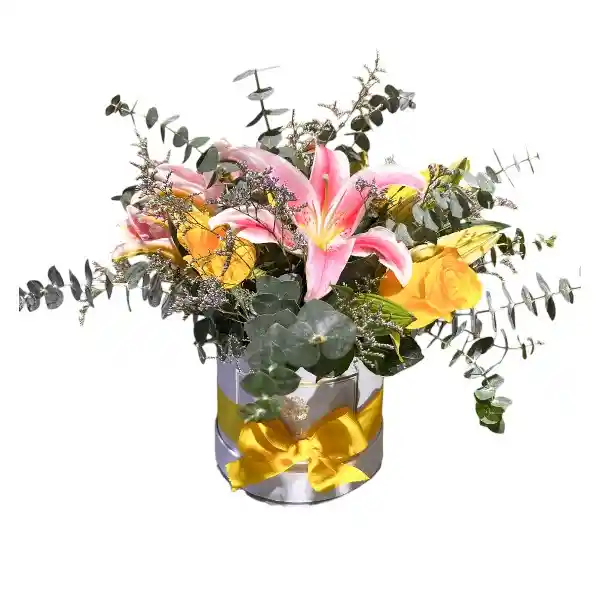 Caja Mediana elaborada en lirios Casa Blanca, rosas amarillas, eucalipto y caspia. Color de caja y lazo sujetos a disponibilidad.