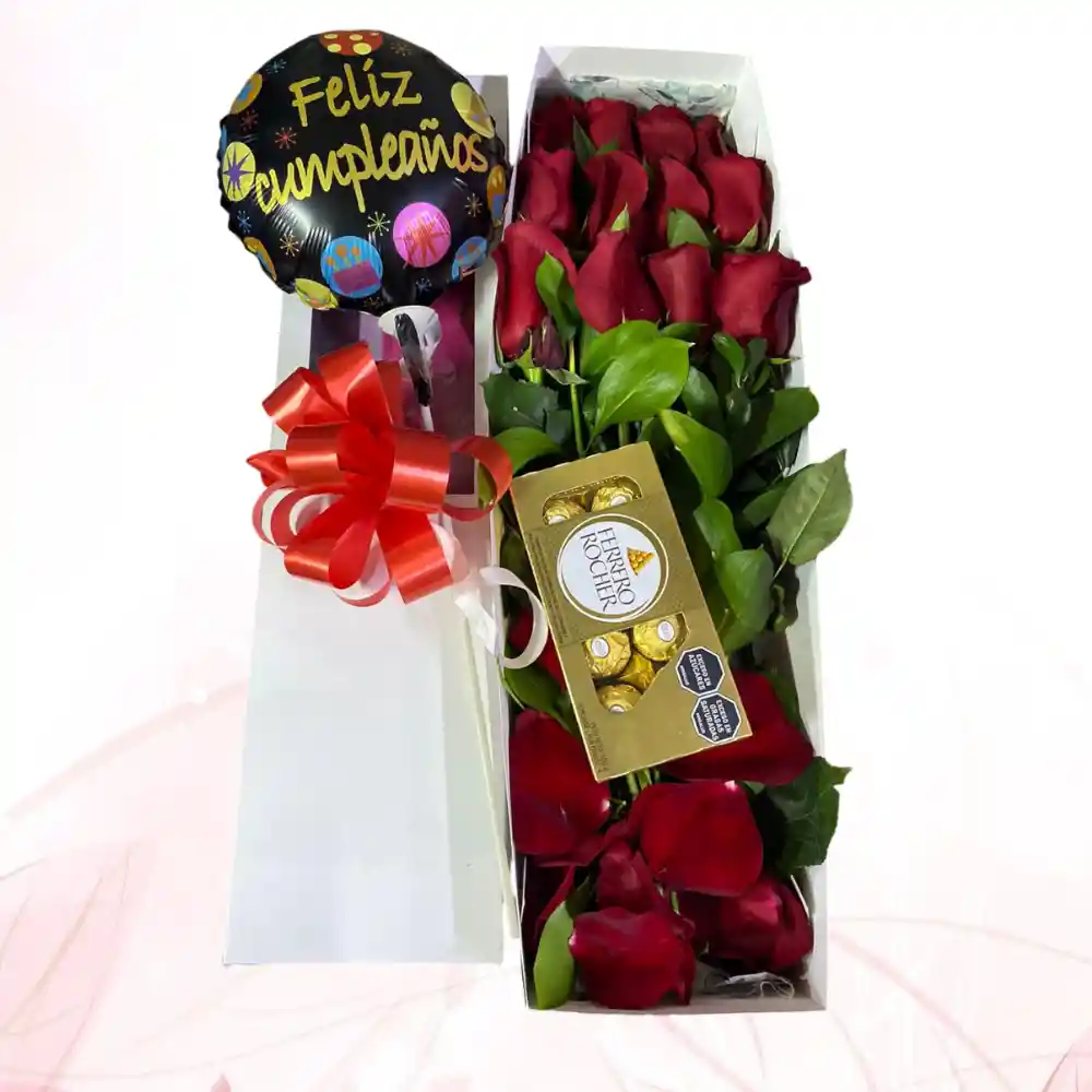 Sorprende con un regalo elegante y lleno de amor. Incluye una caja premium con rosas rojas frescas, chocolates Ferrero Rocher y globo decorativo de cumpleaños, presentada con moño de lujo. Ideal para cumpleaños y ocasiones especiales.
