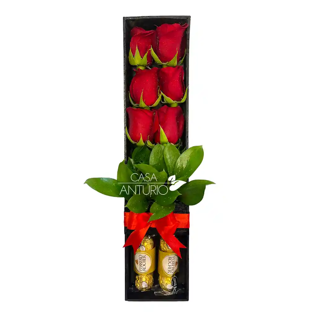 Caja Rectangular con 6 Rosas y 6 bombones de Chocolate Ferrero Rocher
