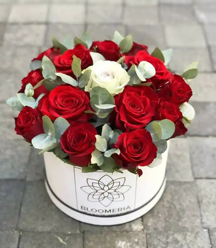 Un mar de rosas rojas rodea una sola rosa blanca que brilla en el centro, como ese amor que destaca entre todos. El contraste intenso de los pétalos carmesí con el blanco puro y el toque verde de los eucaliptos crea un arreglo clásico, elegante y profundamente romántico. Perfecto para decir “eres la única” de una forma directa, sofisticada y memorable.