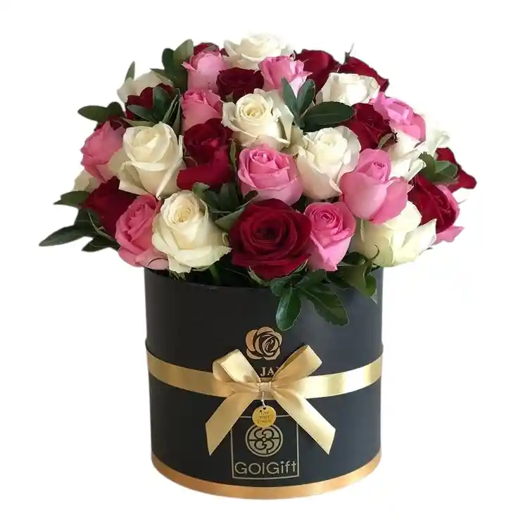 Eleva el arte de regalar con este lujoso arreglo floral en caja cilíndrica premium de color negro, diseñado para cautivar a primera vista. Esta composición artística presenta una densa cúpula de rosas premium en una armoniosa mezcla de rojo intenso, blanco puro y rosa delicado, creando un contraste sofisticado y romántico.