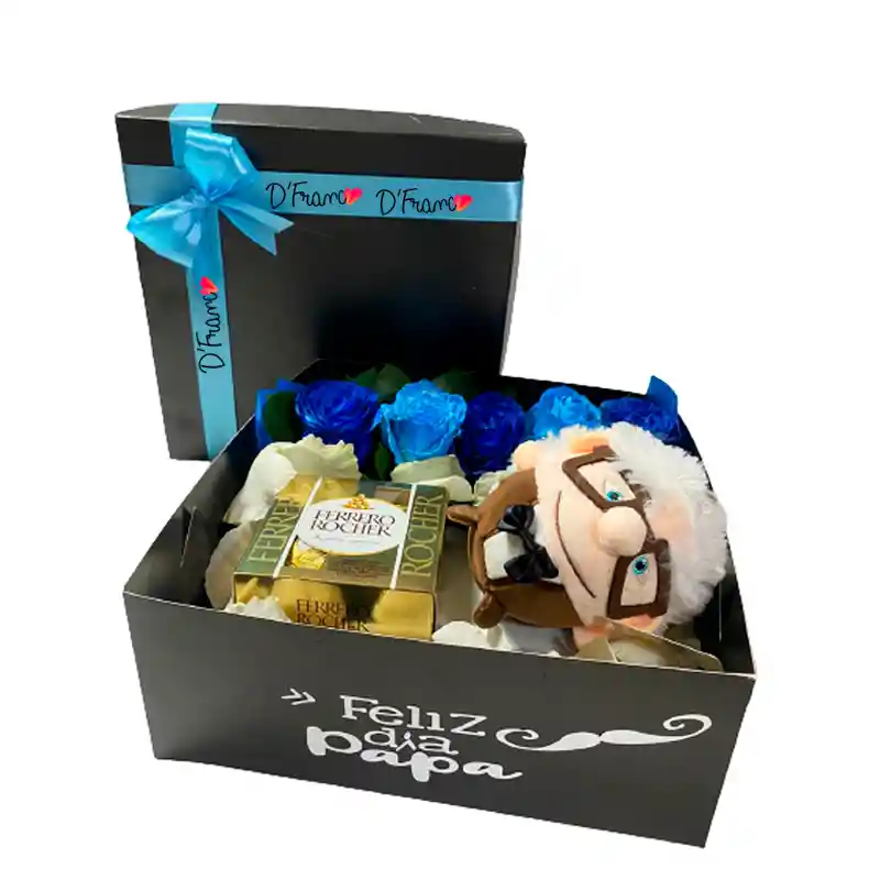 Linda Caja regalo incluye: *Arreglo floral de rosas color azul *Caja Negra personalizada con frases como: *Feliz dia del Padre *Te Amo * Feliz Dia * Feliz Cumpleaños (Recuerda dejar su elección en los comentarios) *Caja de Chocolates Ferrero x4 * Peluche viejito Up llavero Recuerda que tu detalle incluye tarjeta