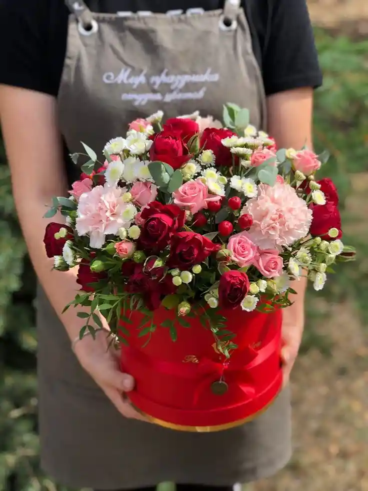 Arreglo floral en caja roja decorativa con una combinación de rosas rojas, mini rosas rosadas, claveles rosa pastel y margaritas blancas. Incluye follaje fresco y detalles de hypericum rojo que aportan textura y un toque vibrante. Es un diseño elegante y llamativo, ideal para aniversarios, cumpleaños, celebraciones románticas o como regalo especial para sorprender. La caja viene adornada con listón rojo y base en detalles dorados.