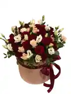 Caja redonda de 30 rosas entre blancas , rosadas y rojas con rusco Nota: La flor puede ser sustituida dependiendo la disponibilidad de color y del producto “Mensaje Personalizado” máximo de 30 caracteres (Dejar el mensaje en el chat, los comentarios no se previsualizan para la tienda por lo que si se dejan allí no podrá ser incluido).