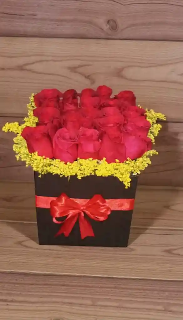 Arreglo floral presentado en caja cuadrada, compuesto por 20 rosas rojas frescas acompañadas de solidago, que aporta un contraste delicado y luminoso. Un detalle sobrio y elegante, ideal para expresar amor, admiración o celebrar una ocasión especial con estilo. ✨️Magia en tus flores.