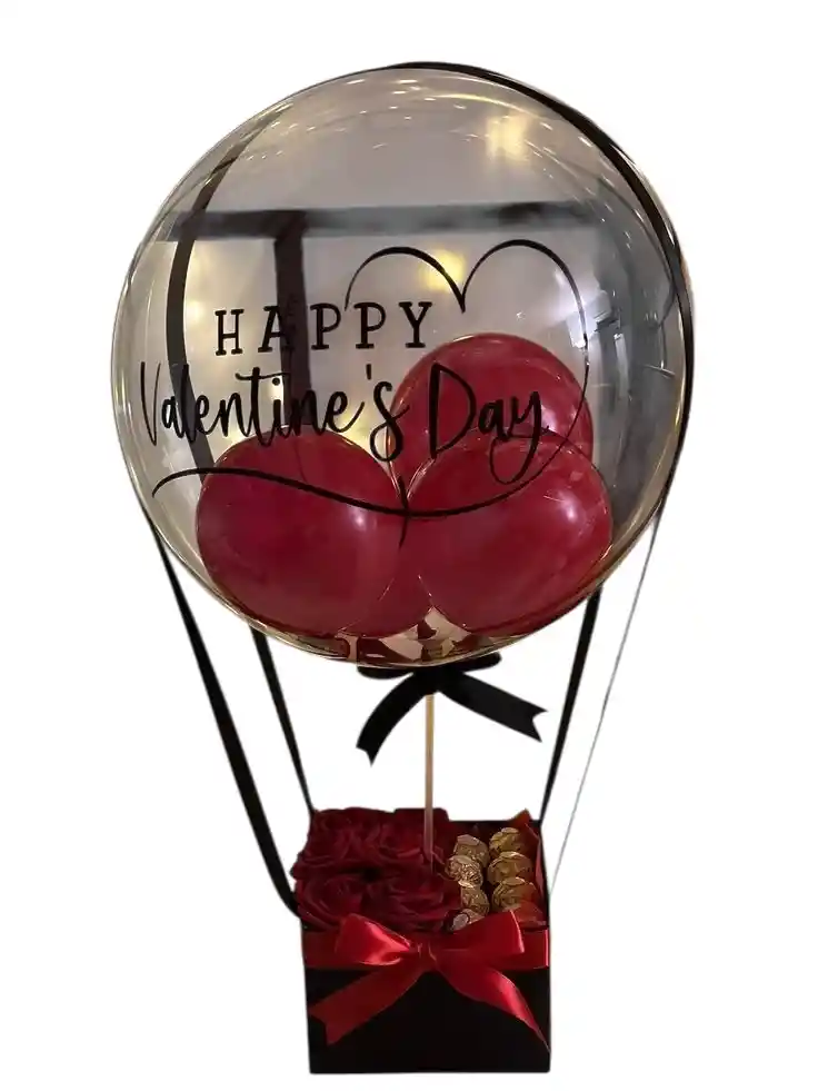 es una pieza de diseño creativa y festiva, perfecta para elevar cualquier celebración a un nivel superior de sorpresa. El detalle presenta una elegante base de caja negra de lujo que resguarda rosas rojas aterciopeladas y bombones Ferrero Rocher, fusionando el romance con el placer gourmet.