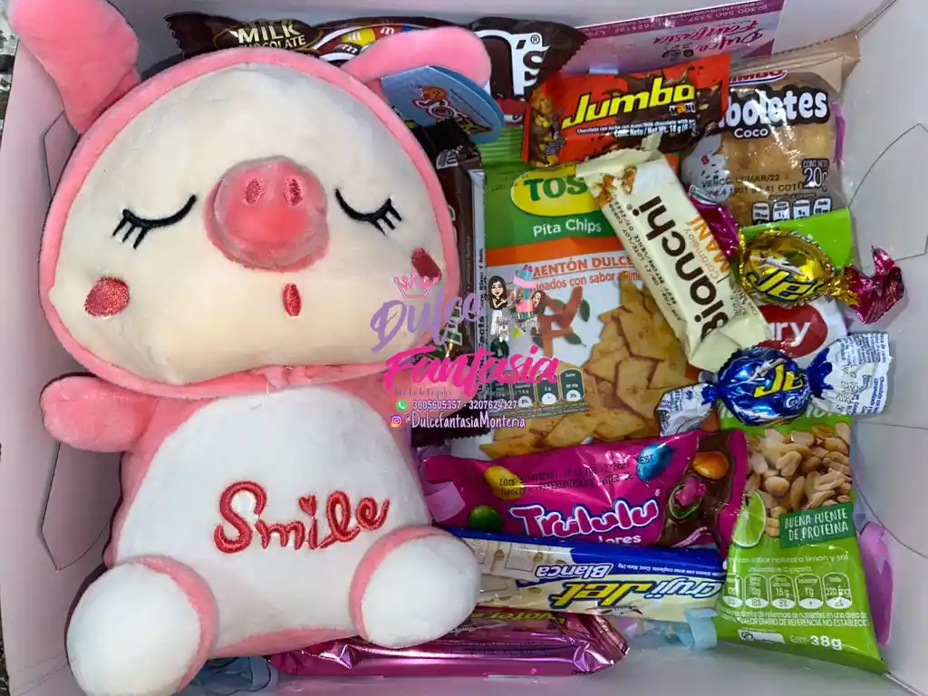 "Peluche cerdito (según disponibilidad) Tosh pasabocas Maní limon Chocolatina jet Trululu Bianchi Jumbo pequeña Ponquesito Mickywey Myms Jet waffer Burbuja jet x2 Caja de cartón Globo en helio de látex "