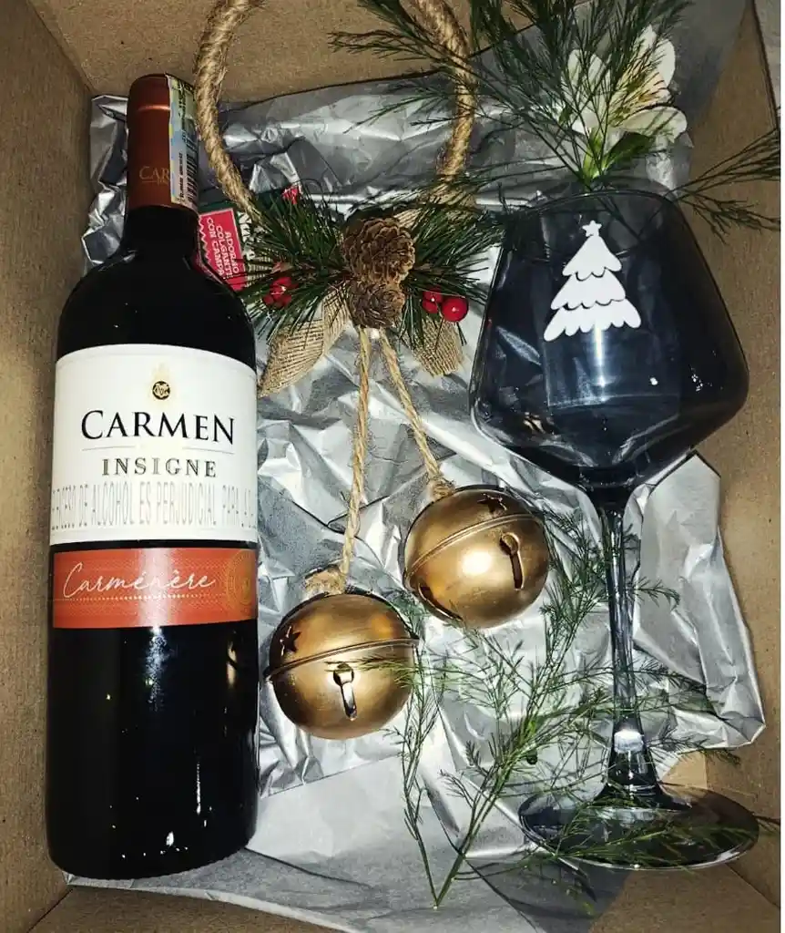 Caja Sorpresa, de regalo Navidad Contiene: Vino Carmen Insigne Copa de navidad adorno de navidad tarjeta de navidad