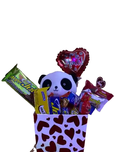 Un regalo tierno, colorido y delicioso, perfecto para sorprender a alguien especial 💝 Esta hermosa caja decorada con corazones rojos incluye aproximadamente 14 dulces variados, cuidadosamente acomodados para crear una presentación llamativa y llena de amor. 🧸 Incluye: 1 peluche de panda suave y adorable 1 globo metálico en forma de corazón con la frase “Te Amo” Aproximadamente 14 dulces surtidos (chocolates, gomitas, barras y snacks reconocidos) Presentación en caja decorativa temática romántica