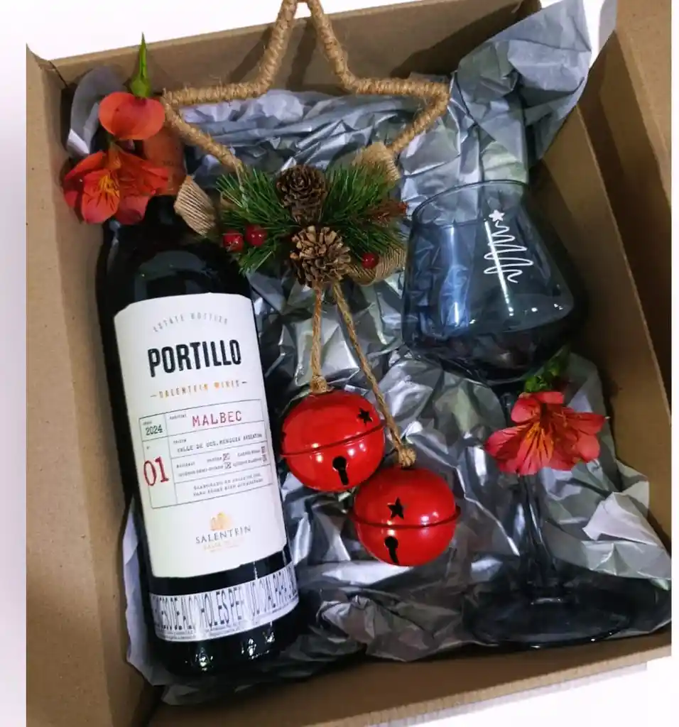 Caja Sorpresa Regalo de Navidad Incluye: Caja de cartón corrugado Copa de Navidad Adorno de Navidad Vino Portillo Tarjeta de Navidad