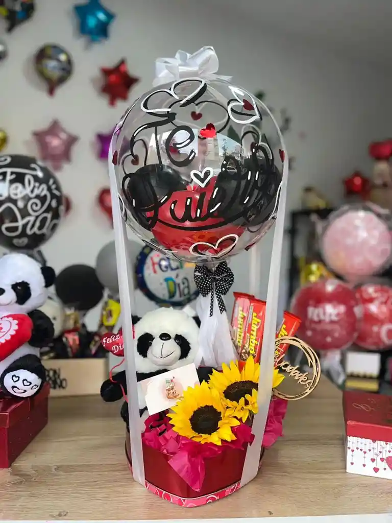 Incluye: caja de corazón de metal, girasoles x2, chocolatina jumbo x3, cartel en madera feliz cumpleaños, oso panda de 35 CM , globo decorativo , decoración y mensaje personalizado