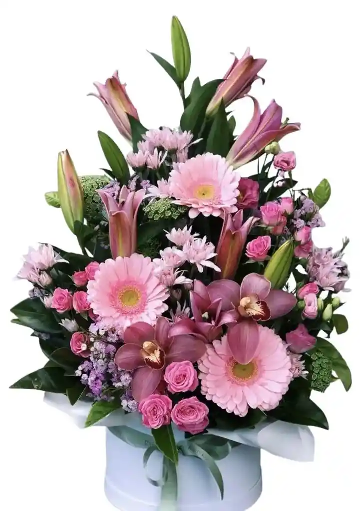 Un elegante arreglo floral en caja redonda con una hermosa combinación de flores rosadas, 3 gerberas , 12 rosas minis , 6 lirios , medio paquete de margarita y rusco perfecto para transmitir dulzura, ternura y cariño en cualquier ocasión. Nota: La flor puede ser sustituida dependiendo de la disponibilidad de color y del producto. "Mensaje Personalizado" máximo de 30 caracteres (Dejar el mensaje en el chat, los comentarios no se previsualizan para la tienda, por lo que si se dejan allí no podrá ser incluido).