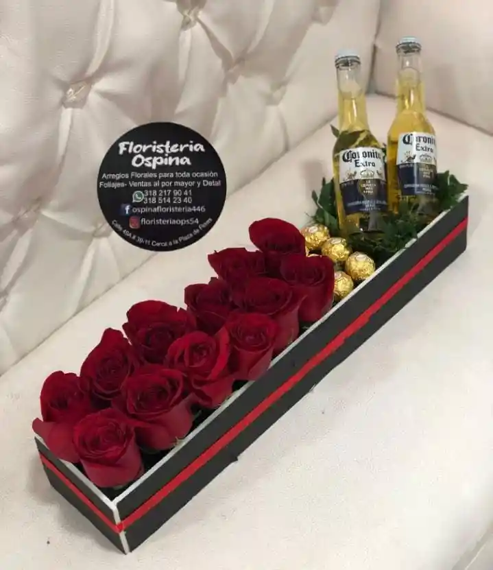 Arreglo elaborado con Rosas rojas, follaje, chocolates Ferrero Rocher, cervezas Corona y caja decorativa.