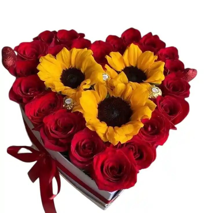 es una pieza de diseño floral que irradia luz, energía y romance profundo. El arreglo se presenta en una elegante caja artesanal en forma de corazón, donde un marco de rosas rojas premium de pétalos aterciopelados abraza un centro radiante de tres majestuosos girasoles.