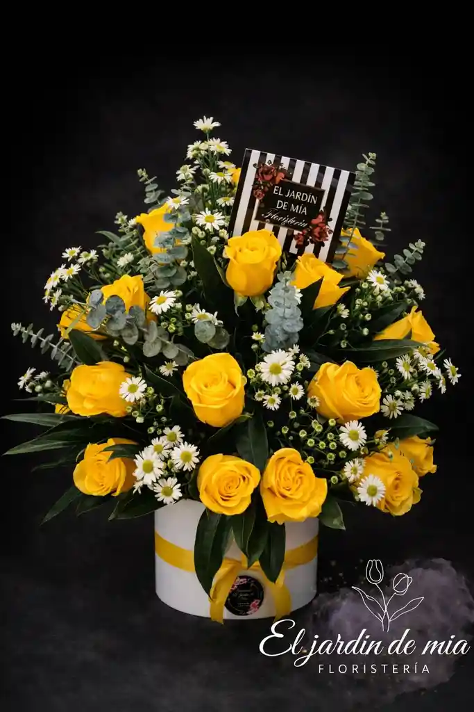 tambor con rosas amarillas aster blanco, eucalipto cinta y tarjeta