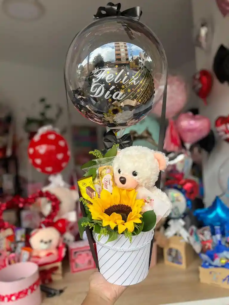 Caja circular (varía según disponibilidad), peluche de oso (varía según disponibilidad), girasol x1, chocolate tipo Ferrero x3, chocolatina kick x1, globo burbuja personalizado, mensaje personalizado.