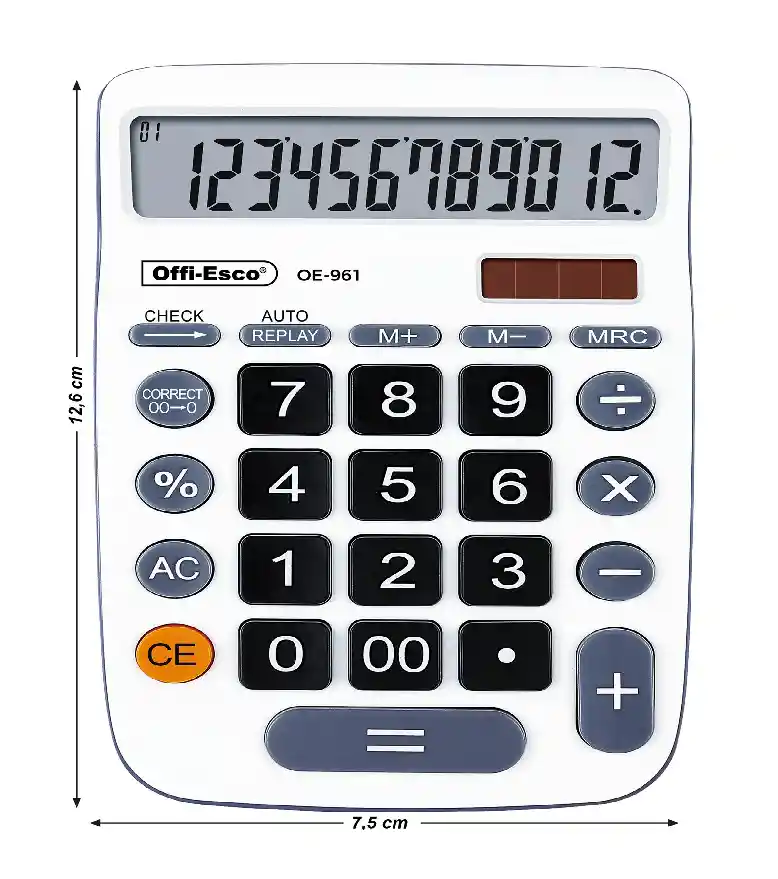Tamaño Grande de 12,6 cm a 7,5 cm Botón de replay el cual repite automáticamente todas las operaciones registradas Botón de chequeo una a una las operaciones realizadas Te permite borrar uno a uno los números digitados Incluye panel solar Pantalla inclinada que facilita la lectura Posee doble fuente de energía Tiene teclas suaves Gran pantalla LCD Incluye tecla de porcentaje Calculadora portable