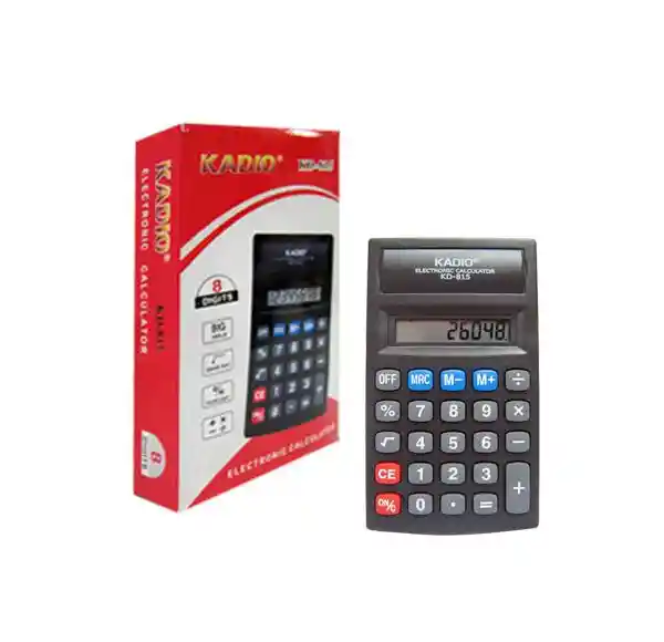 Calculadora Kadio 8 digitos de bolsillo.Funciona con bateria AA.Medidas aproximada : alto 11 cm ancho 6.5 cm.