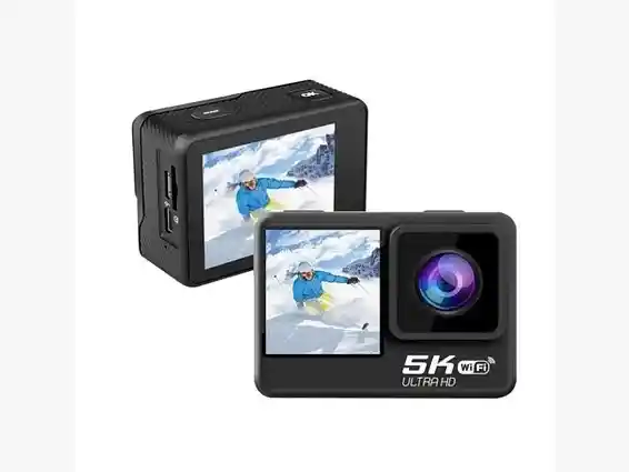 dispositivo compacto diseñado para grabar aventuras en alta definición (4K real), caracterizado por su doble pantalla (2.0" trasera táctil + frontal), lente gran angular de 170° y resistencia al agua (sumergible con carcasa)