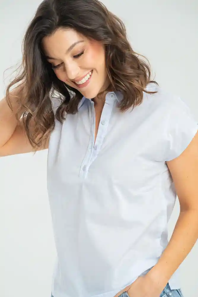 Camisa en tejido plano fondo entero, escote en V con perilla que ajusta con botones 18L tono a tono, manga corta, cuello camisero con banda, aberturas en los laterales, silueta semi ajustada.