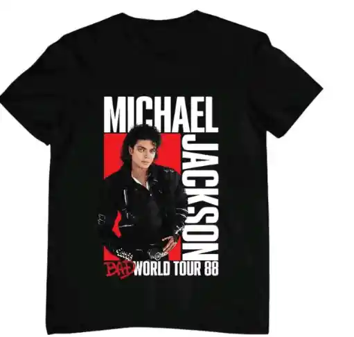 nterpretación general del diseño: Esta camiseta es un homenaje directo a la legendaria Bad World Tour de Michael Jackson de 1988. La combinación de su imagen potente, el logo "Bad" y la mención de la gira y el año, la convierte en un artículo de colección para los fans. El diseño es audaz y representa perfectamente la estética y la energía de esa época en la carrera de Michael Jackson, cuando estaba en la cima de su poder como "Rey del Pop".