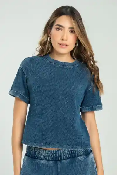 En Tejido de Punto Piqué Color Azul Índigo Tono Oscuro Con Manualidad Cuello Redondo Manga Corta Con Guardapolvo Largo Pretina.