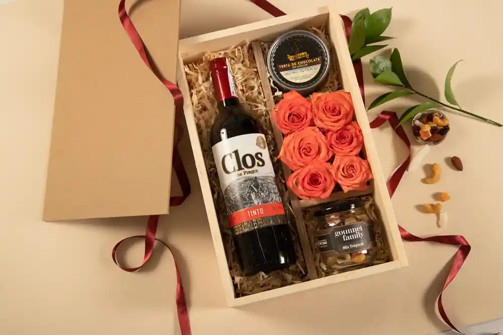 Botella de vino (750 ml) acompañada de torta de chocolate sin azúcar (150g), mix tropical con frutas deshidrat...Ver más