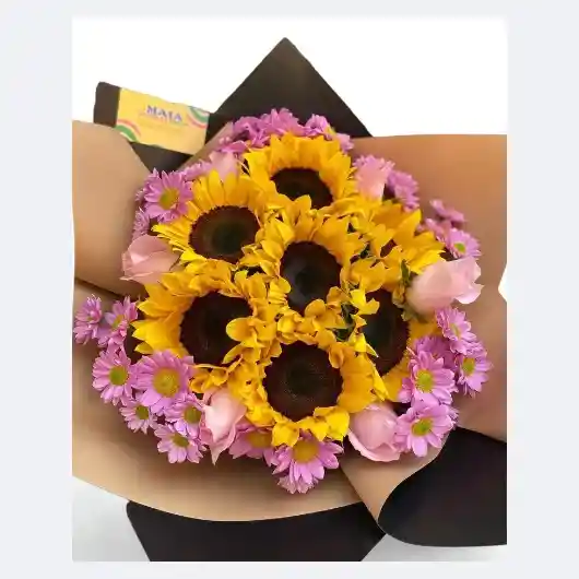 Bouquet de 7 girasoles margarita y 6 rosas Nota: La flor puede ser sustituida dependiendo la disponibilidad de color y del producto “Mensaje Personalizado” máximo de 30 caracteres (Dejar el mensaje en el chat, los comentarios no se previsualizan para la tienda por lo que si se dejan allí no podrá ser incluido).