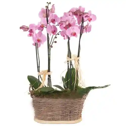 canasta de fique con dos orquídeas phalaenopsis de 2 varas cada una en color aleatorio tarjeta con mensaje( enviar el texto al momento de la compra o se envia en blanco)