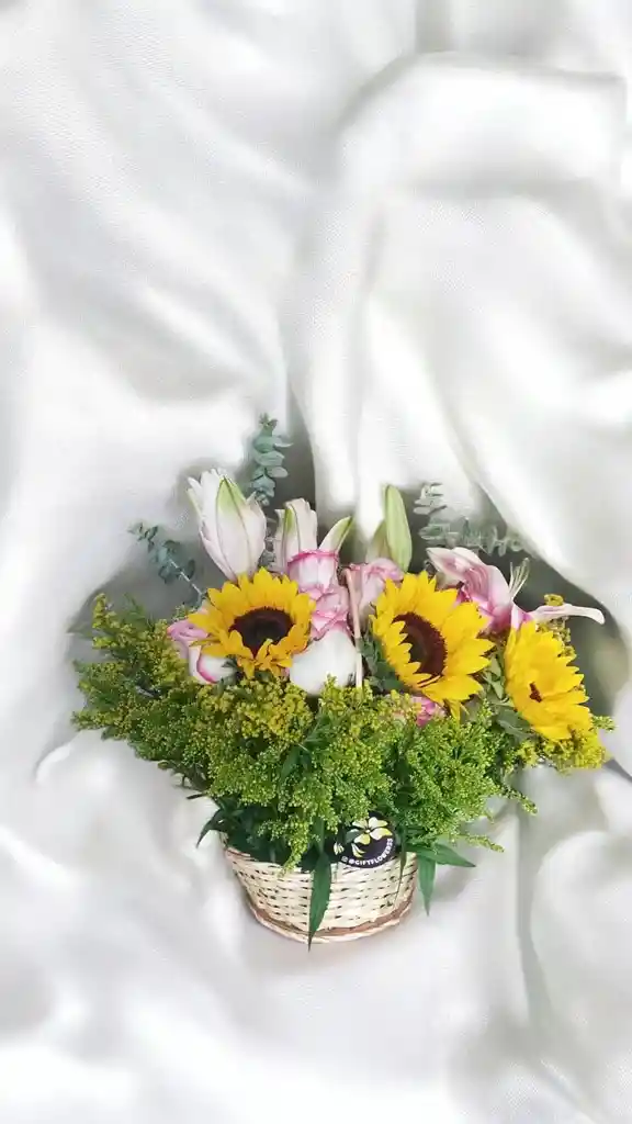 Canasta mediana, de rosas rosadas, con 4 girasoles y 4 varas de lirios, acompañadas de solidago. Nota: La flor puede ser sustituida dependiendo la disponibilidad de color y del producto “Mensaje Personalizado” máximo de 30 caracteres (Dejar el mensaje en el chat, los comentarios no se previsualizan para la tienda por lo que si se dejan allí no podrá ser incluido).