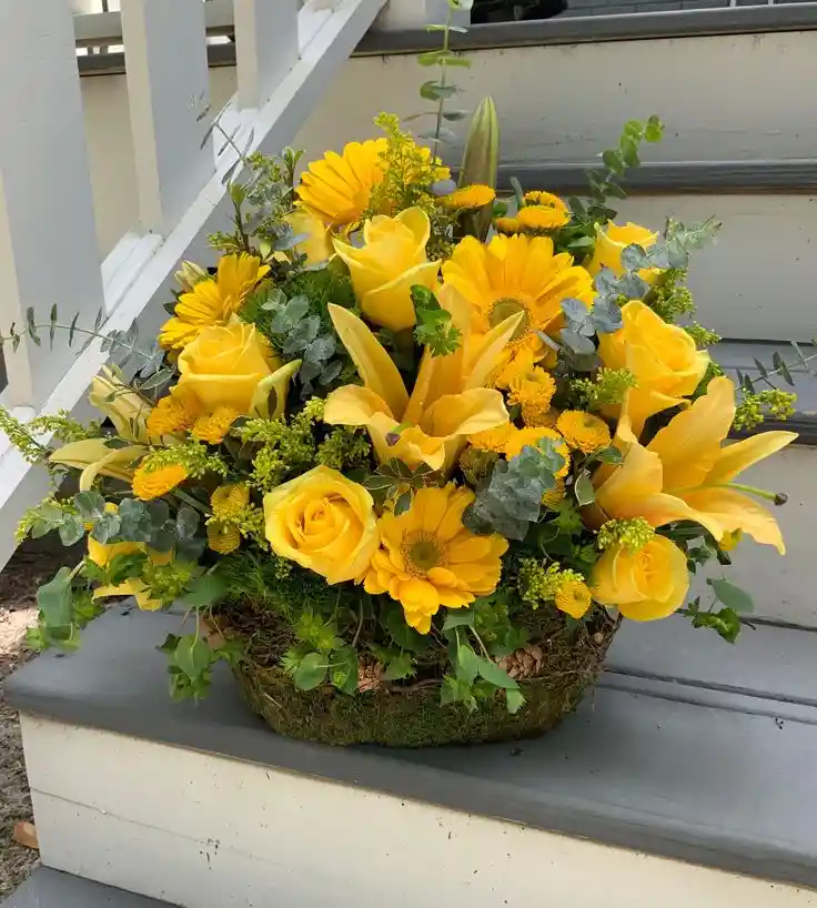 Canasta mix de flores amarillas, con rosas, gérberas y lirios. La flor puede ser sustituida dependiendo la disponibilidad de color y del producto “Mensaje Personalizado” máximo de 30 caracteres (Dejar el mensaje en el chat, los comentarios no se previsualizan para la tienda por lo que si se dejan allí no podrá ser incluido).