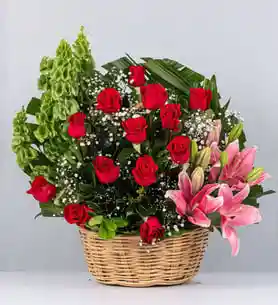 24 rosas con liiros en una canasta Con Mensaje Personalizado, máximo de 30 caracteres (Dejar el mensaje en el chat, los comentarios no se previsualizan para la tienda por lo que si se dejan allí no podrá ser incluido)