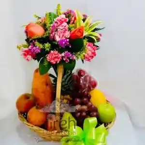 Canasta frutal compuesta por ramo de rosas y clavel, 3 manzanas, 2 peras, 2 granadilla, un ramillete de uva y una piña, una papaya, durazno, una bandeja de fresas, base exclusiva de mimbre y tarjeta impresa con mensaje personalizado.