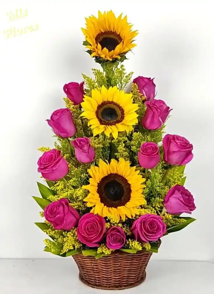 Incluye: girasol x3, rosa rosada x13, decoracion, mensaje personalizado