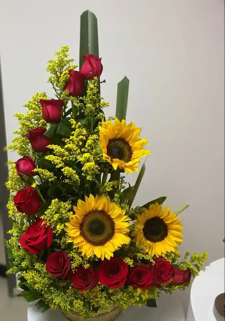 Incluye: girasol x3, rosa roja x12, decoracion, mensaje personalizado