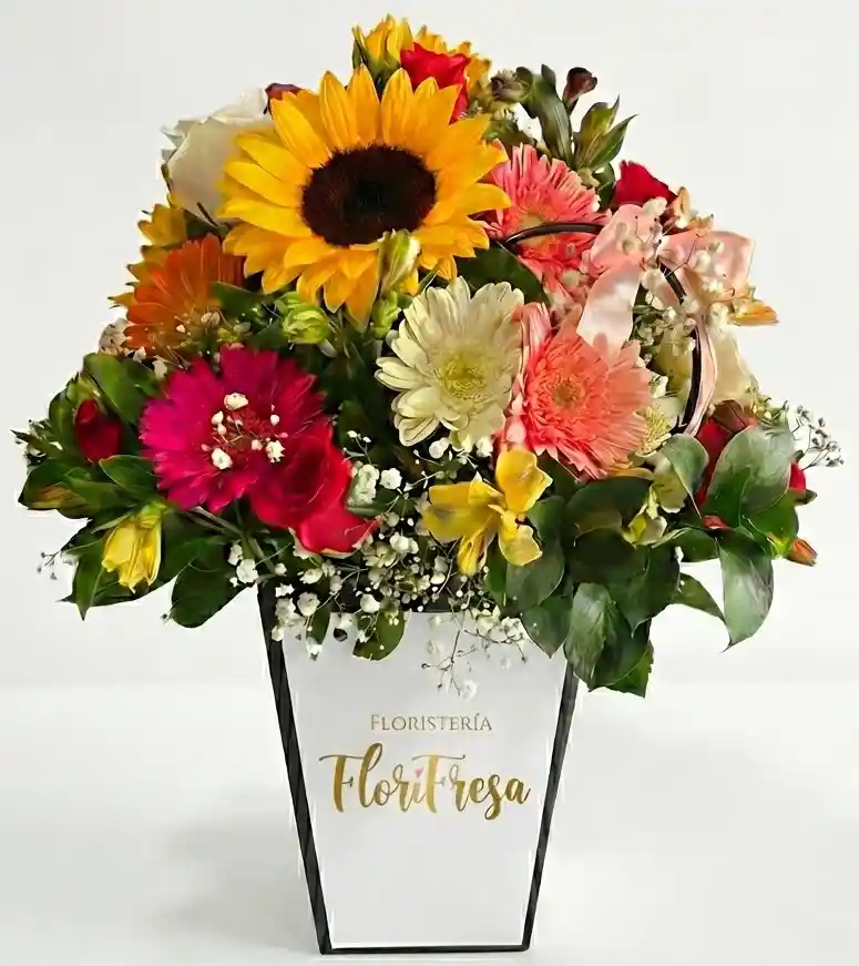 Cartera variado con gerberas, girasoles, rosas y follajes.