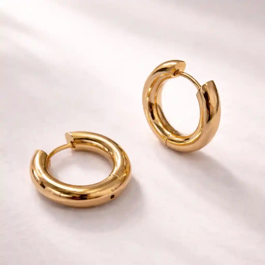 Acero quirúrgico Hipoalergenico.Talla S Diámetro externo: 2 cmGrosor: 4 mm Peso: 4,1 g aprox. Las joyas doradas y rosadas tienen un baño de oro de 18k. Resistentes al agua.