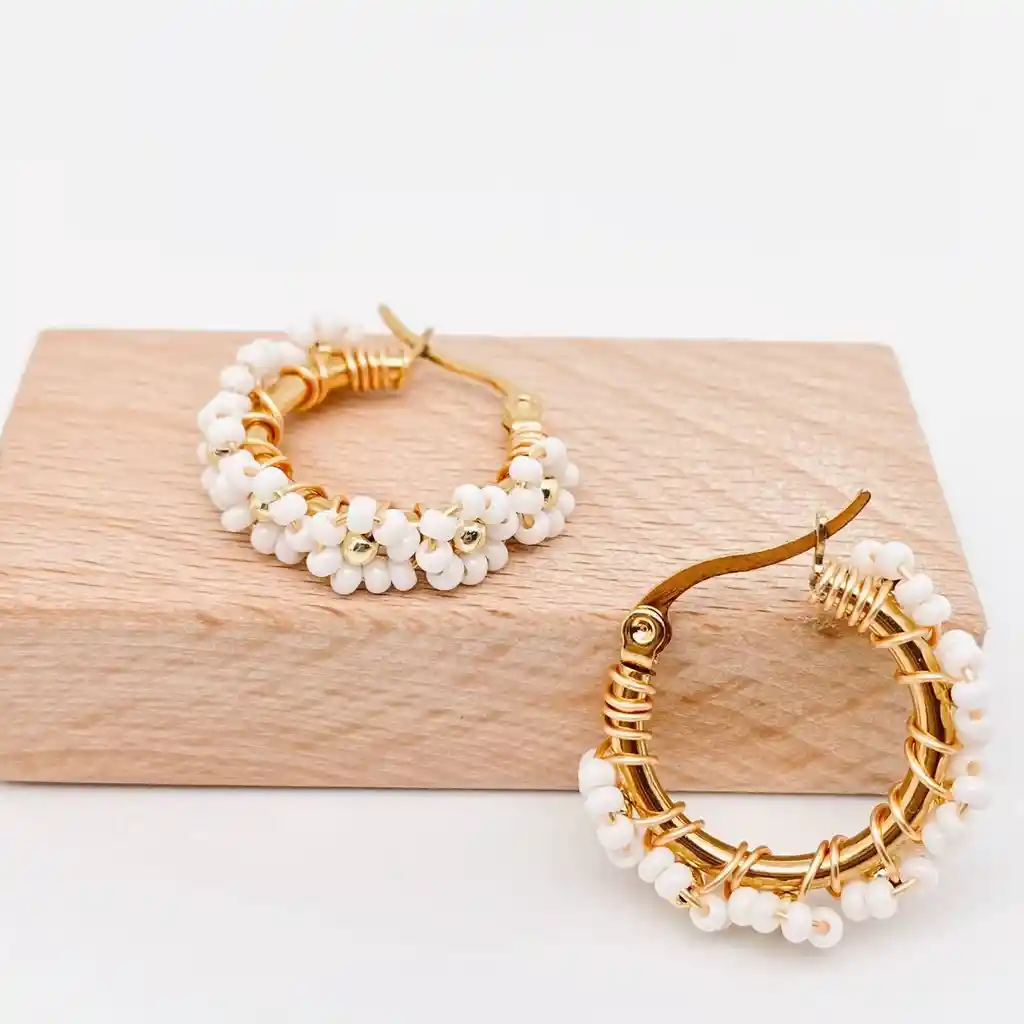 Candongas en acero con baño de oro de 18k, tejidas a mano con mostacillas. Su diseño delicado y romántico evoca la frescura de la primavera, logrando un accesorio ligero, elegante y versátil para cualquier ocasión.