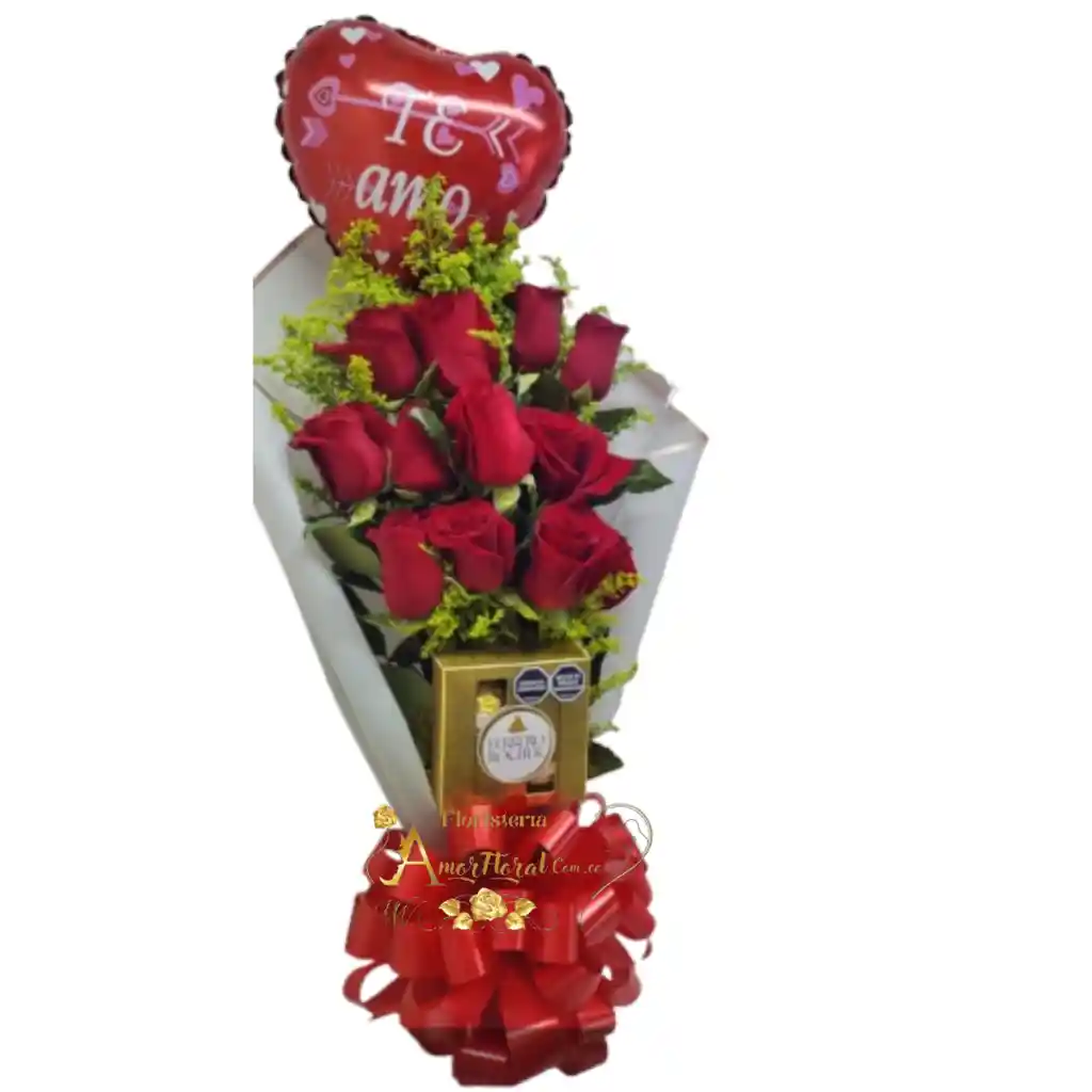 bouquet por 12 rosas, chocolate ferrero por 4 unidades, globo metalizado r-9, si deseas un mensaje para la tarjeta lo puedes dejar escrito en el área de observaciones o escribirnos al whatsapp al 3143111616 y enviarnos el mensaje para la tarjeta.