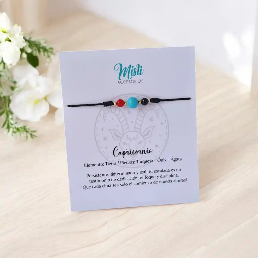 Conéctate con la energía de tu signo zodiacal Lleva contigo la fuerza de los astros con nuestra pulsera zodiacal con piedras naturales. Cada una está cuidadosamente diseñada con piedras auténticas que potencian las cualidades de tu signo, brindándote protección, equilibrio y armonía. Características: - Hecha con piedras naturales seleccionadas según tu signo: CAPRICORNIO: Ágata - Onix - Turquesa. - Energía alineada con tu elemento zodiacal (agua, fuego, tierra o aire) - Diseño exclusivo y ajustable para mayor comodidad Ya sea que busques fortaleza, serenidad o una conexión más profunda con el universo, este accesorio será tu amuleto ideal. Elige la tuya hoy y deja que el poder de los astros ilumine tu camino. Si deseas un color de hilo diferente al de la publicación, indícanos por mensaje una vez realices tu compra. Estamos atentos a responder cualquier duda o información adicional que necesites, con gusto te atenderemos!!