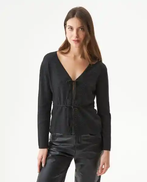 Tejido Para Mujer Oversize Fit Cuello en V Profundo Con Perilla Abierta. Lazos Decorativos en Cuello y Cintura Que Aportan Toque Femenino y Delicado. Elaborado en Tejido Jersey de Galga Súper Liviana Mezcla de Viscosa Con Hilos Metalizados Color Plata Que Ofrece Ajuste Perfecto y Brillo Sutil Ideal Para Looks Versátiles y Elegantes. Placa Metálica de Chevignon en Parte Superior de la Espalda. Ean- 799G009Neg194007 Plu- 1111133162981.