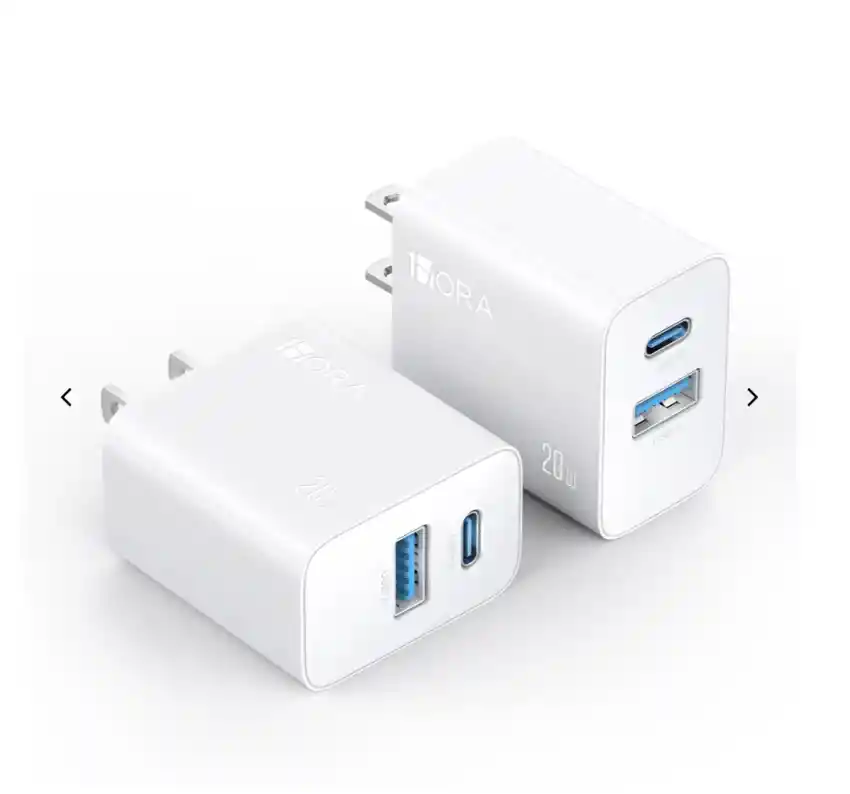 Cargador de pared 20W con doble puerto. Permite cargar dos dispositivos al mismo tiempo. Carga rápida y protección contra sobrecargas.