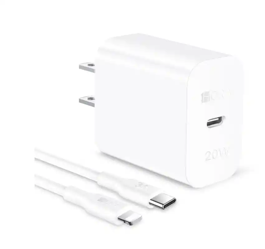 Cargador de pared 20W con carga rápida para dispositivos Lightning. Compatible con iPhone 6 en adelante. Sistema de protección inteligente para mayor seguridad.