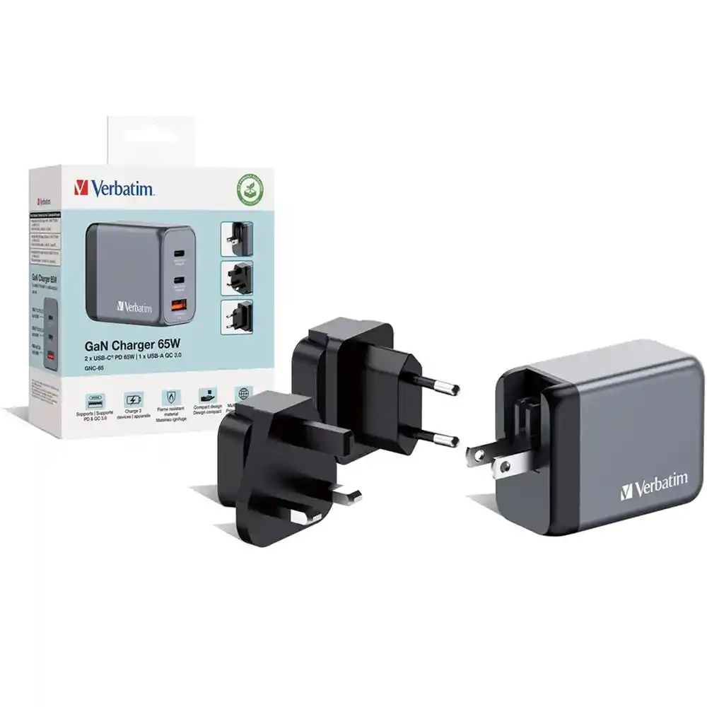 Utilizar cables de conexión originales, carga hasta 3 dispositivos al mismo tiempo de manera rápida El cargador de pared Verbatim 65W GaN combina dos puertos USB-C PD 3.0 de 65W y un puerto USB-A QC 3.0 de 30W, permitiendo cargar hasta tres dispositivos simultáneamente con una potencia total combinada de 65W. Gracias a la tecnología GaN (Nitruro de Galio), este cargador ofrece una mayor eficiencia energética, genera menos calor y tiene un tamaño más compacto en comparación con los cargadores tradicionales. Diseño Compacto y Versátil para Viajes: Con clavijas plegables para EE. UU.