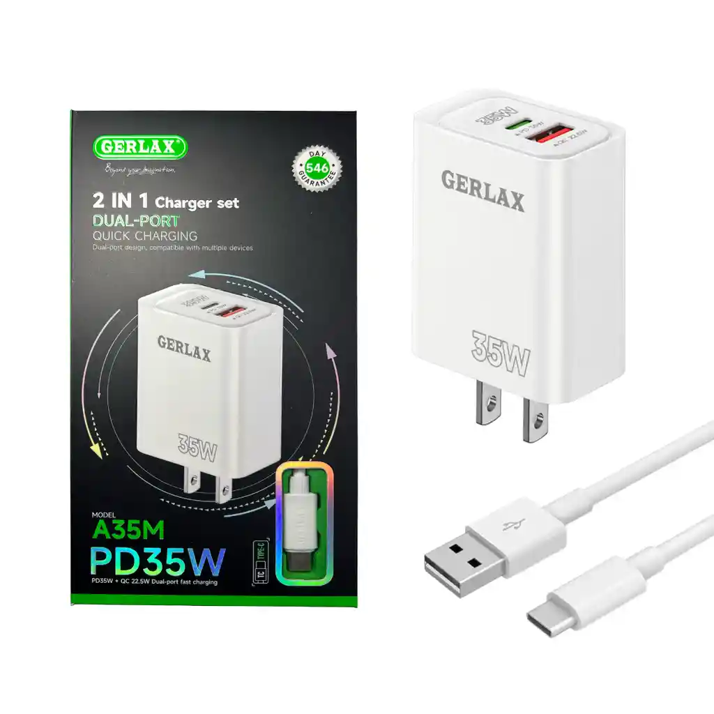 Cargador GERLAX A35M 35W – 2 en 1 (USB - Tipo C) Potencia, velocidad y compatibilidad en un solo equipo. El cargador GERLAX A35M ofrece carga rápida PD 35W + QC 3.0, ideal para smartphones, tablets y otros dispositivos que requieren mayor eficiencia. Características principales: Potencia de salida hasta 35W Doble puerto para cargar dos dispositivos al mismo tiempo Diseño compacto y resistente Incluye cable de carga Carga más rápida, segura y eficiente para tu día a día. Ideal para quienes buscan rendimiento y calidad en un solo producto