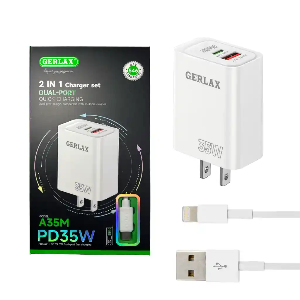 Cargador GERLAX A35M 35W – 2 en 1 (USB - Lightning) Potencia, velocidad y compatibilidad en un solo equipo. El cargador GERLAX A35M ofrece carga rápida PD 35W + QC 3.0, ideal para smartphones, tablets y otros dispositivos que requieren mayor eficiencia. Características principales: Potencia de salida hasta 35W Doble puerto para cargar dos dispositivos al mismo tiempo Diseño compacto y resistente Incluye cable de carga Carga más rápida, segura y eficiente para tu día a día. Ideal para quienes buscan rendimiento y calidad en un solo producto