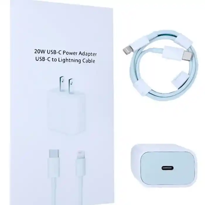 CARGADOR Iphone 20w Carga rapida 1:1 Adaptador de corriente USB -C de 20 W Cargador usb tipo C 20W PD Carga rápida Entrada: AC100-240V 50 / 60Hz 0.5A internacional universal Potencia de salida: 20 W (máximo) Parámetros de salida: 5V / 3A, 9V / 2A Cargador Carga Rápida tipo C 20W Carga de 0 a 50% en tan sólo 30 minutos. (Dependiendo del modelo y de los Mah del dispositivo) Cable USB-C a Conector Lightning de 1 Metro CONTENIDO DE LA CAJA: – Adaptador de corriente USB-C de 20W – Cable USB-C a Conector Lightning de 1 Metro. - Manual